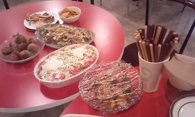 ラーメンサラダ、ライスコロッケなどが並ぶ豪華な食卓でした。素敵。